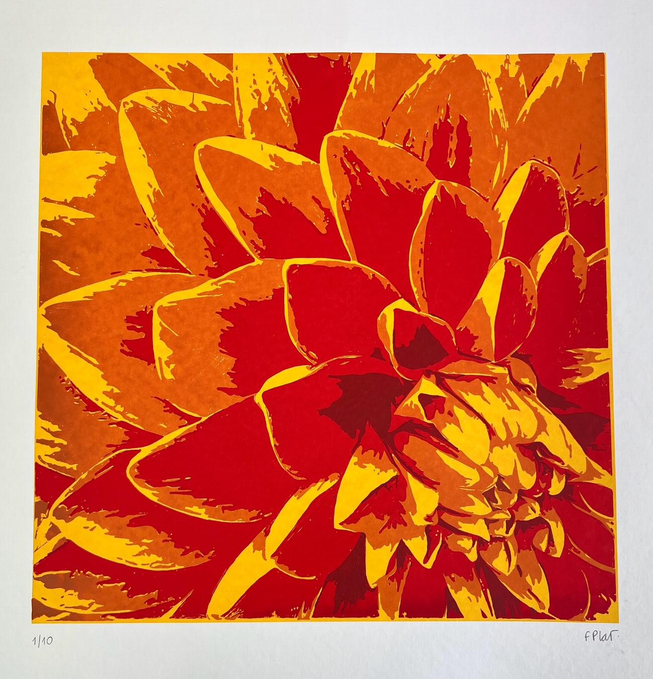 Fabi's work is instantly recognisable for its bold visual language. Drawing on her background in graphic design, she begins each piece with her own photographs, capturing the organic shapes and vivid hues that catch her attention. These images become the foundation for her stylised screen prints, where she distills the essence of nature into crisp forms, layered colours, and striking contrasts.
